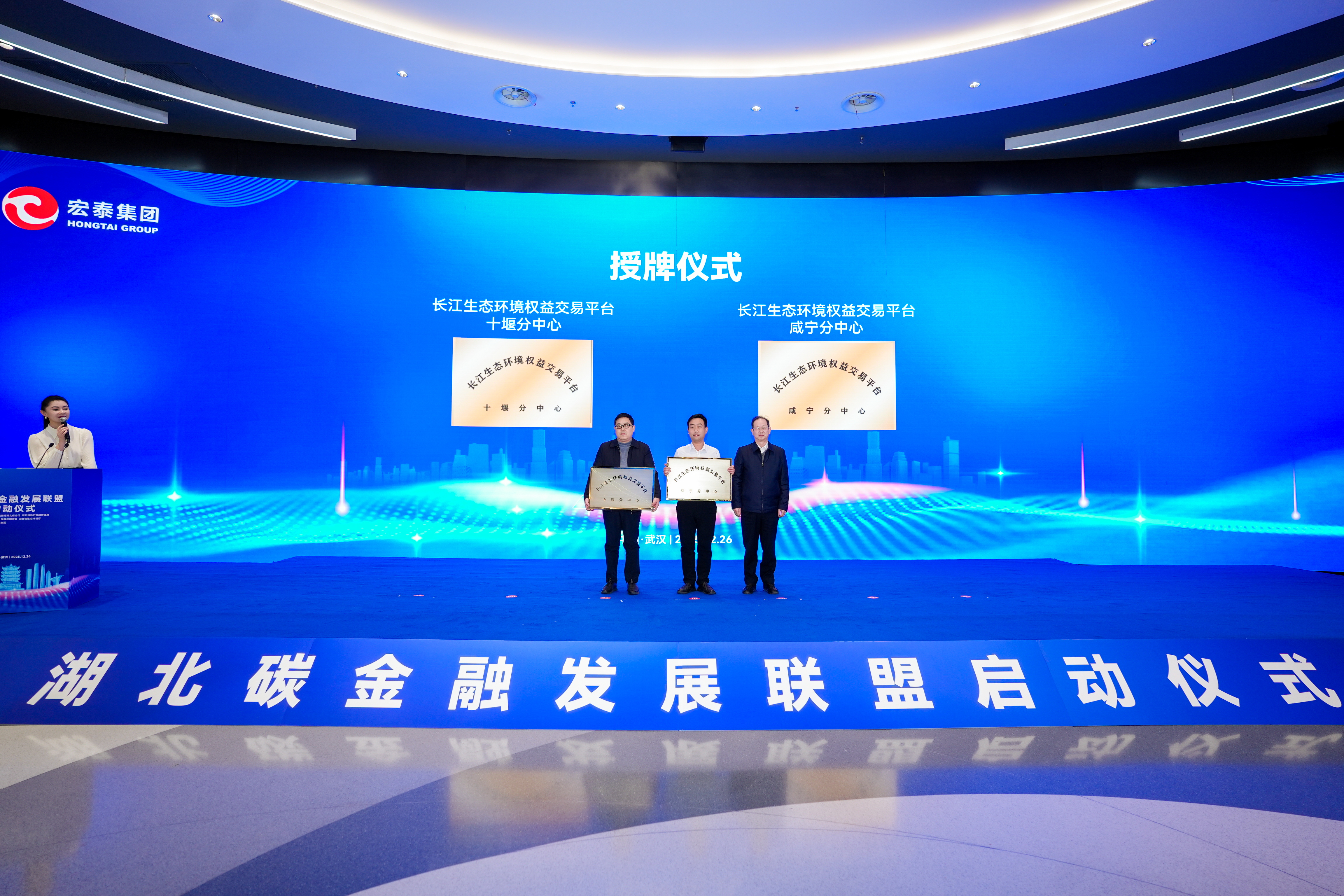 12月26日上午,在湖北省國(guó)資委、省地方金融管理局、中國(guó)人民銀行湖北省分行及省生態(tài)環(huán)境廳的聯(lián)合指導(dǎo)與推動(dòng)下,由湖北宏泰集團(tuán)牽頭組建的“湖北碳金融發(fā)展聯(lián)盟”正式宣告成立。成立大會(huì)上,省生態(tài)環(huán)境廳二級(jí)巡視員田啟代表聯(lián)盟及省級(jí)平臺(tái),向咸寧城發(fā)集團(tuán)旗下綠色產(chǎn)業(yè)發(fā)展投資有限公司授予“長(zhǎng)江生態(tài)環(huán)境權(quán)益交易平臺(tái)咸寧分中心”牌匾,綠產(chǎn)公司總經(jīng)理吳成代表公司接受授牌。